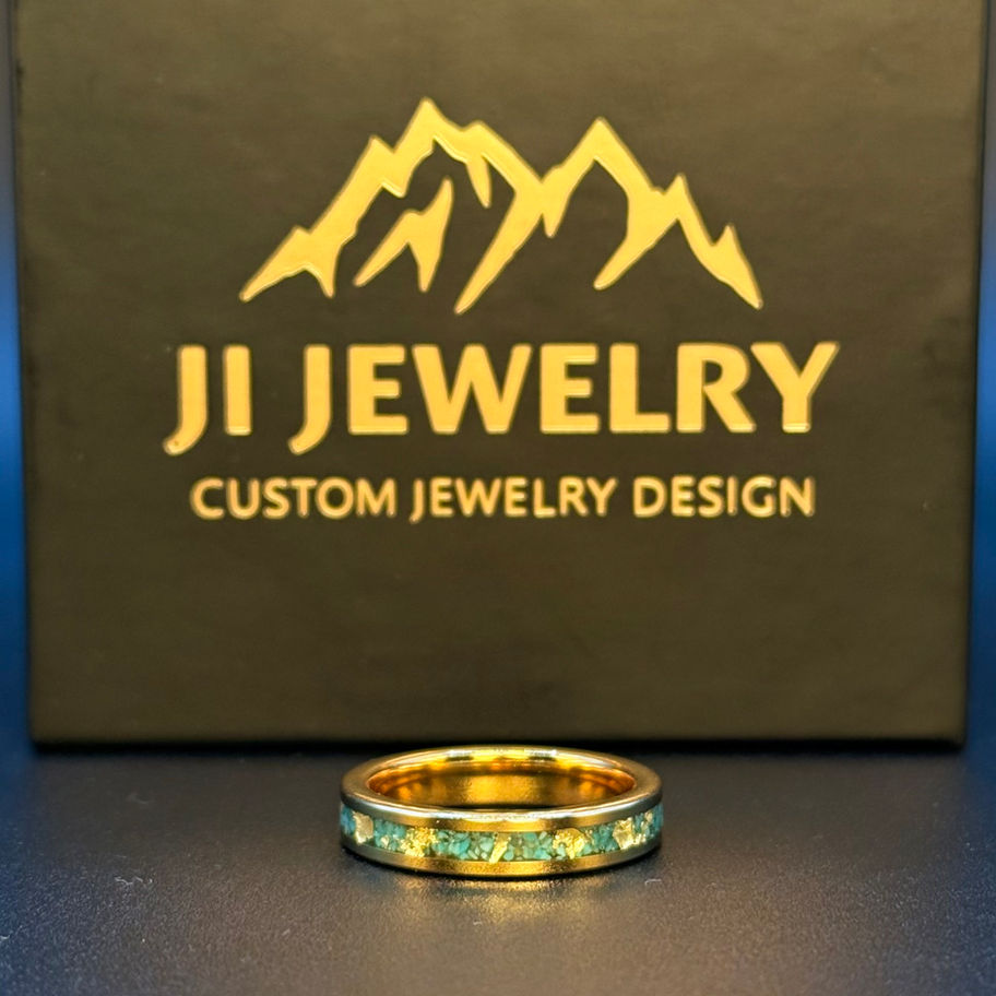 Crafted from durable tungsten, the slim profile offers a refined and comfortable fit. The inlay features genuine turquoise suspended in clear resin alongside real 24 karat gold leaf, creating depth, contrast, and a striking visual effect.